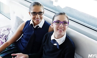 Blond college chick Marina Visconti is testing double ended dildo fucktoy with her lustful Gf